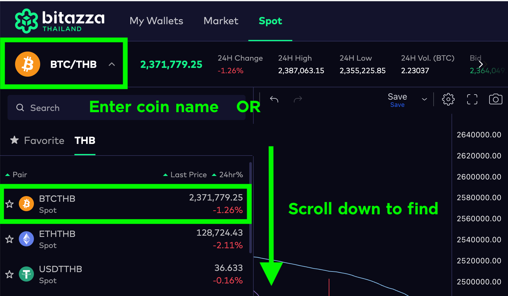 2. Click on the BTC/THB button, then enter the name of the coin you want to trade or scroll down to search