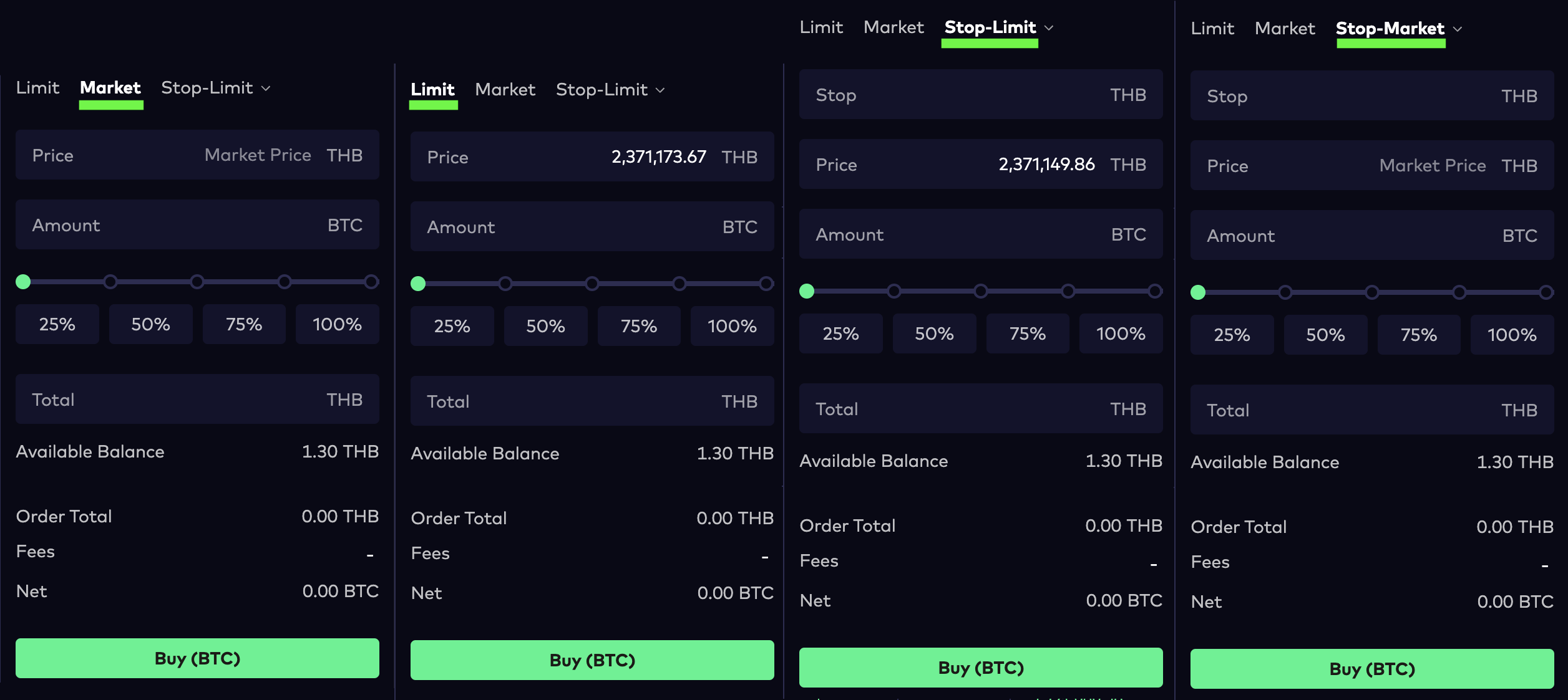 The minimum trading amount is 350 THB per transactionThere are four main order types for four different trading methods