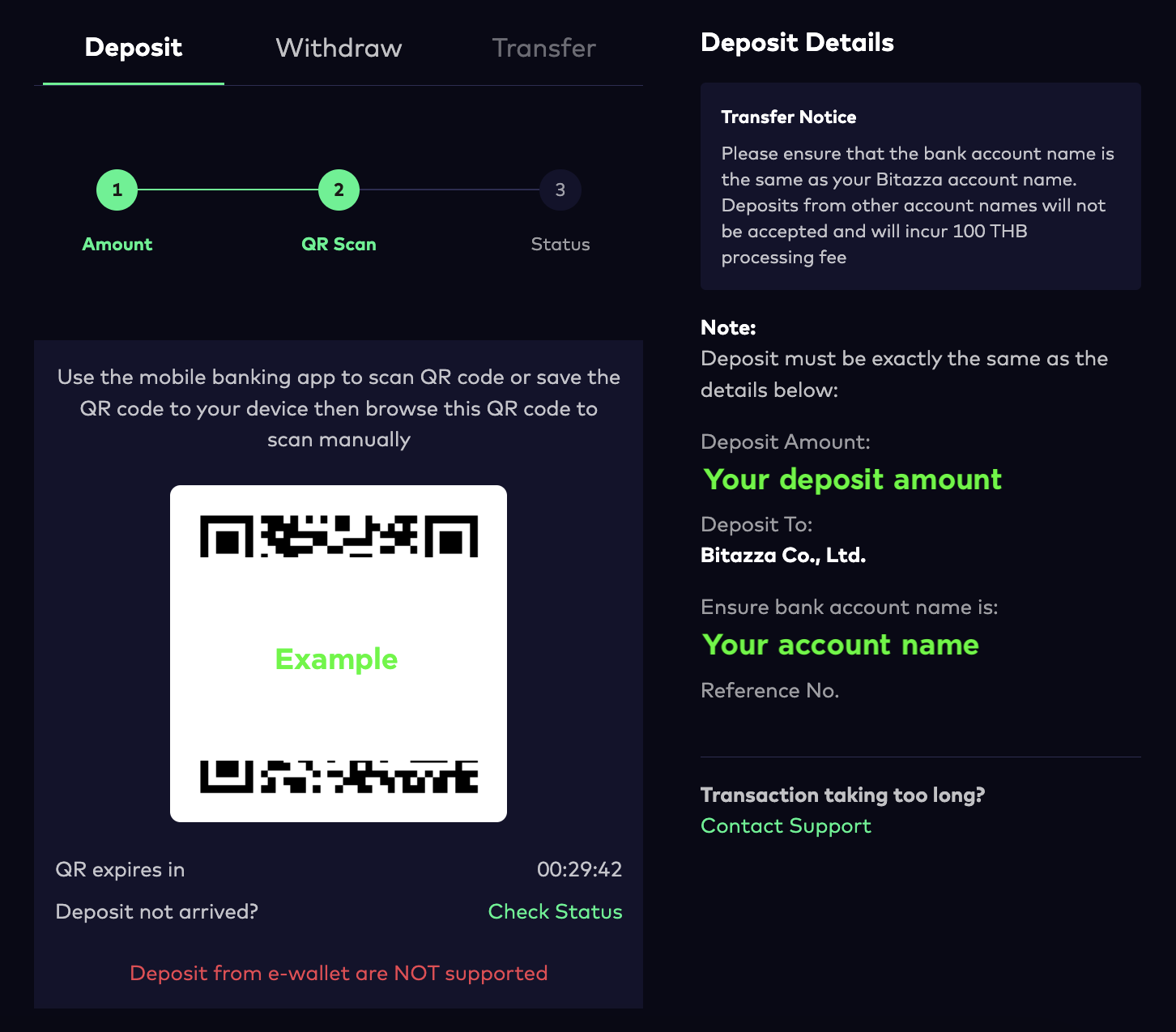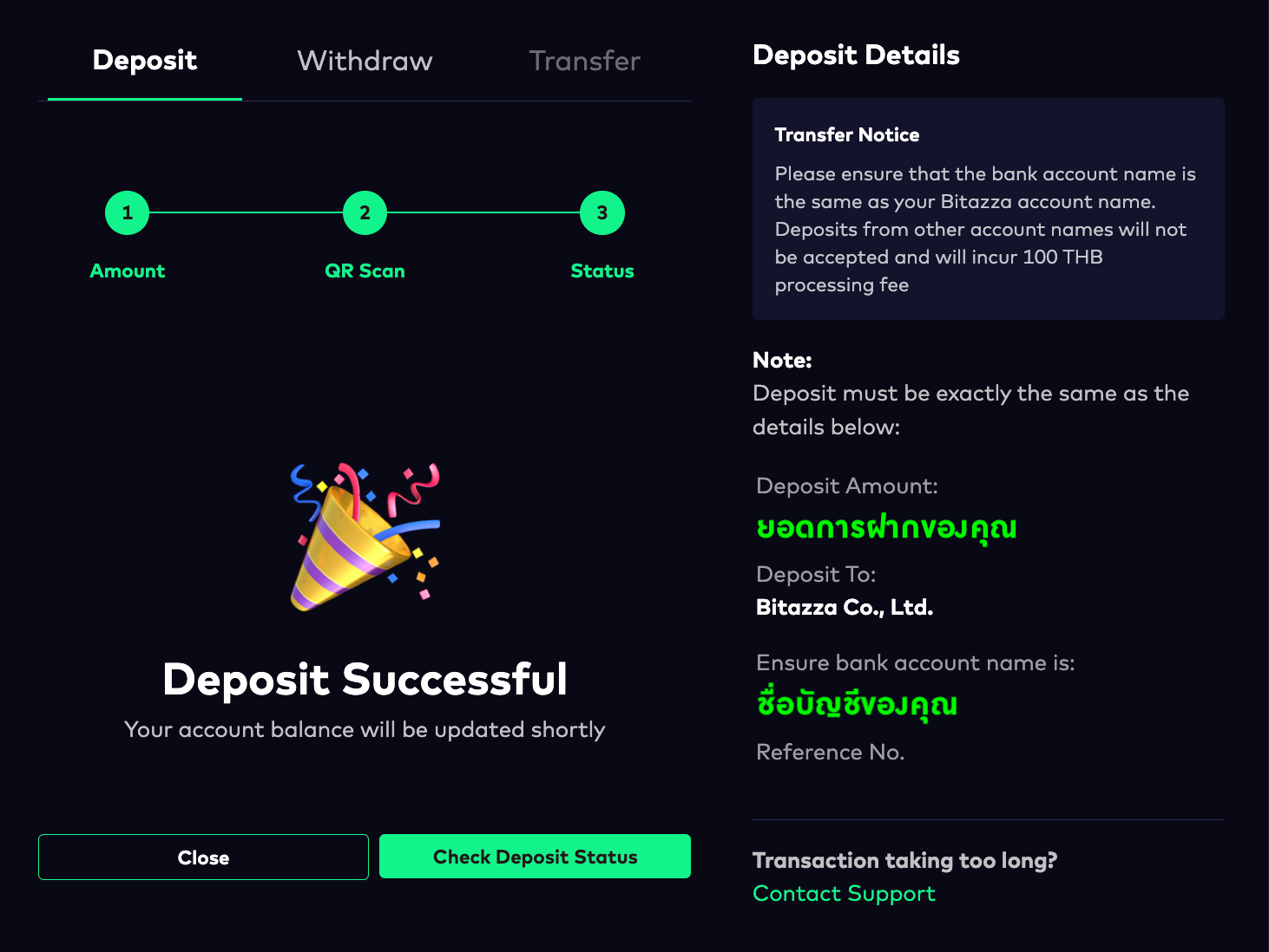 *Deposits can be made from any bank account that matches the name on your Bitazza account, and there is no need to add or change the account before depositing