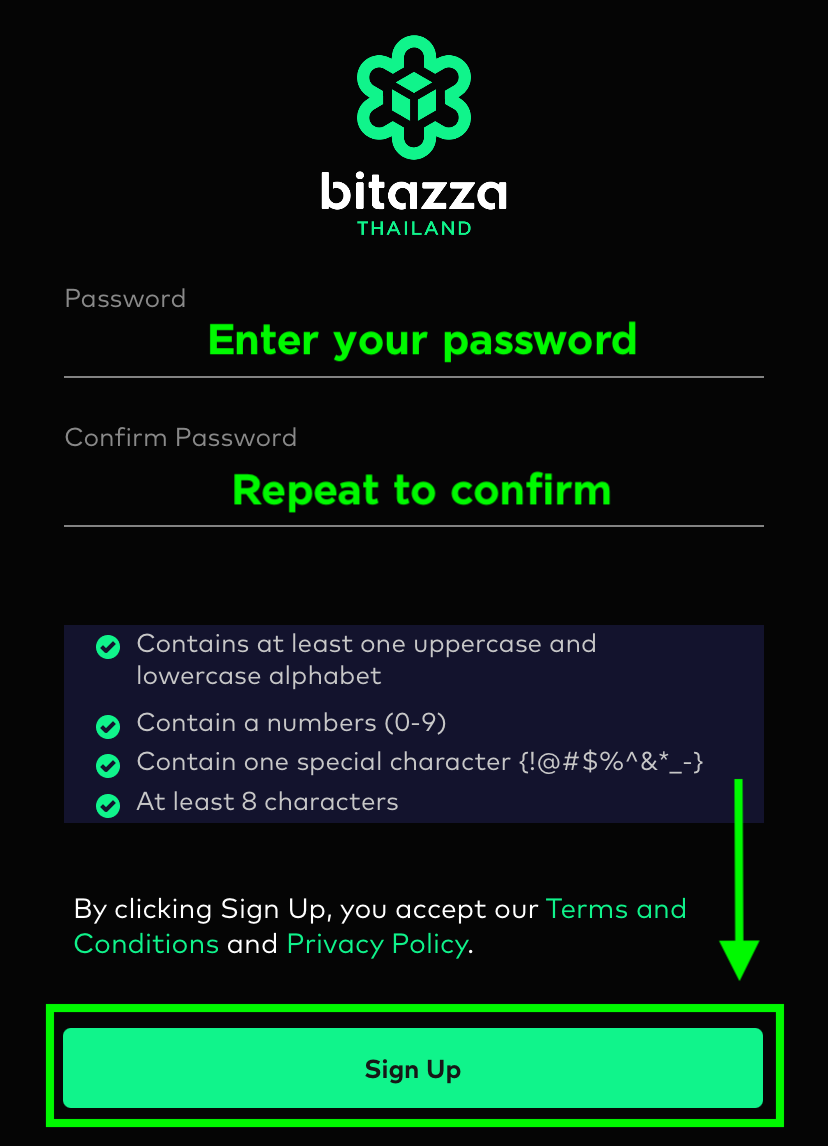 3. Enter the desired password, re-enter it in the 'Confirm Password' field, and then click on 'Sign Up'