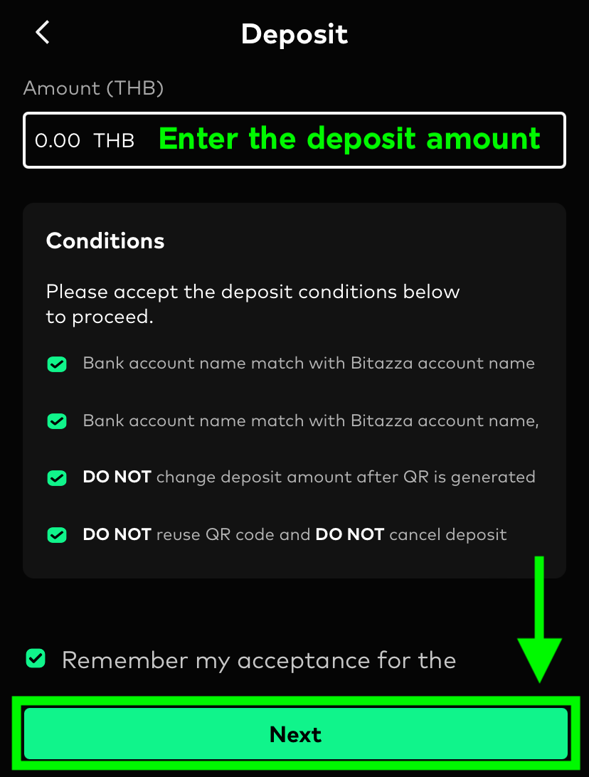 2. Enter the amount of THB you wish to deposit, then click to accept the deposit conditions and click Next.
