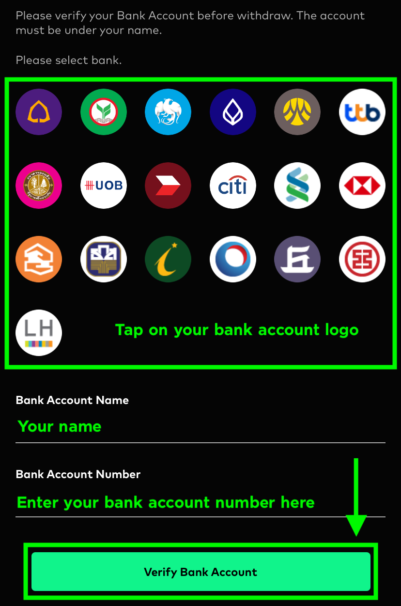 2. If this is your first withdrawal transaction, you will need to enter your bank account information by clicking on your bank's logo, entering your bank account number, and clicking VERIFY BANK ACCOUNT.
