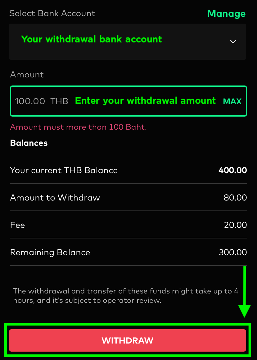 3. Enter the amount of money you wish to withdraw and click the Withdraw button. (minimum 100 THB)