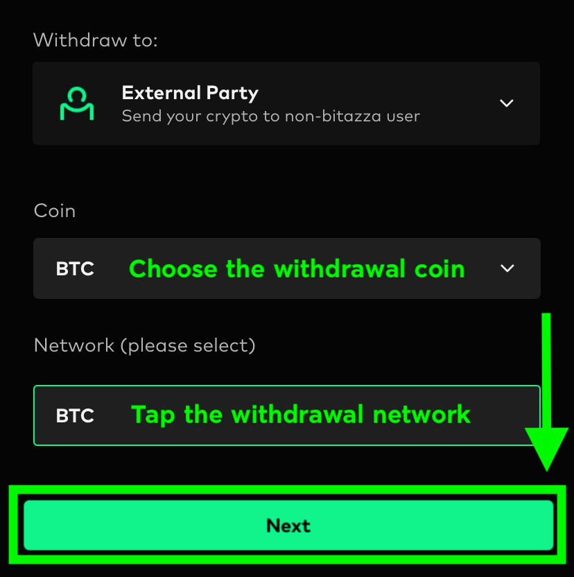 2. Select Crypto and Network, then click 'Next' (The receiver's address and the selected networks must match)