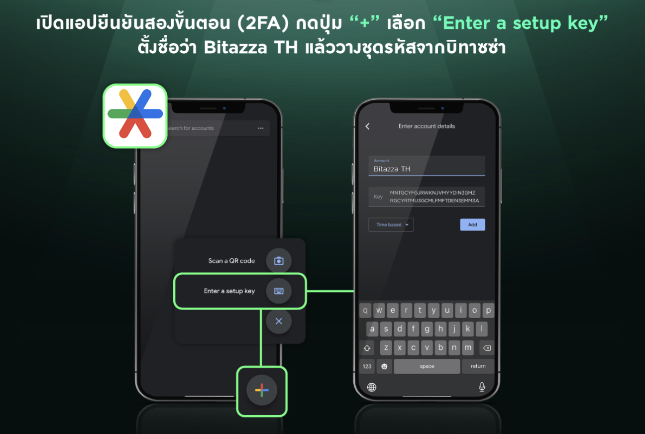 6. เปิดแอปพลิเคชัน 2FA จากนั้นกดปุ่ม '+' เลือก 'Enter a setup key' ตั้งชื่อว่า Bitazza TH แล้ววางรหัสที่คัดลอกมา
