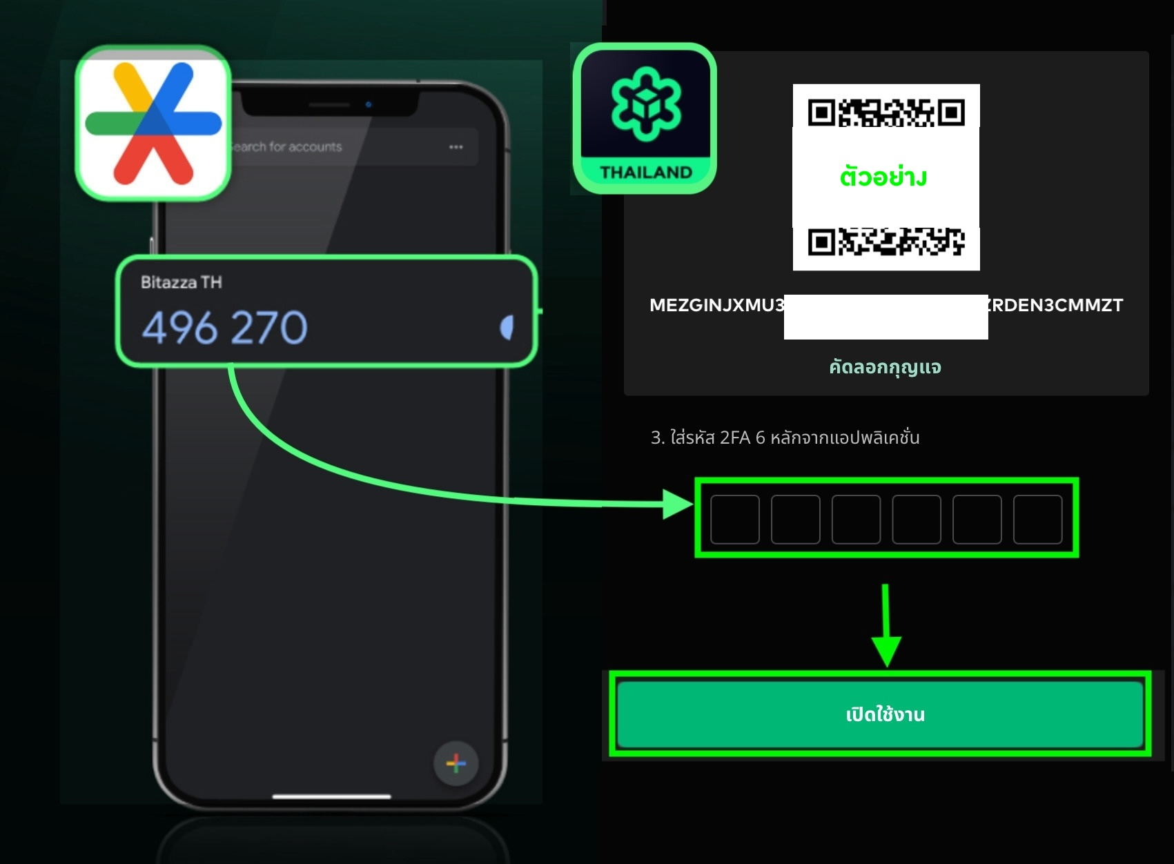 7. กรอกรหัสที่ได้จากแอปพลิเคชัน Google Authenticator หรือ Authy แล้วกดที่ 'เปิดใช้งาน' เป็นอันเสร็จสิ้น