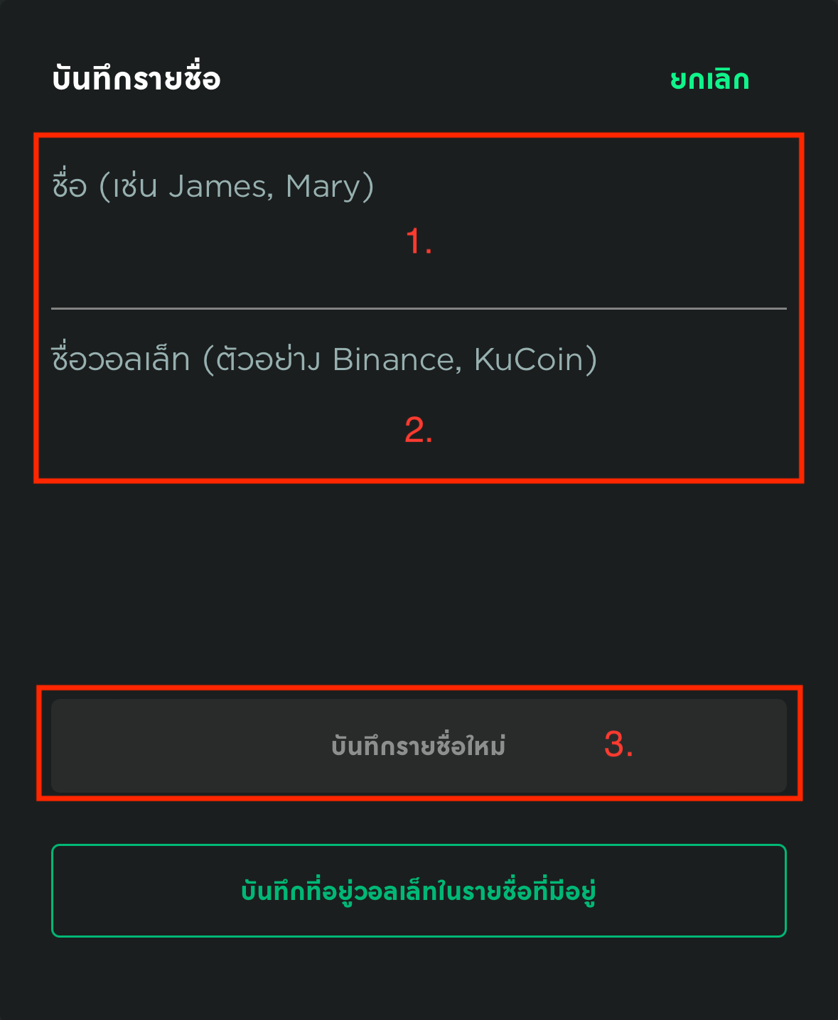 3. หากต้องการใช้ที่อยู่กระเป๋าสตางค์ที่บันทึกไว้ คุณสามารถกดที่ปุ่ม รายชื่อติดต่อ ได้ทันที