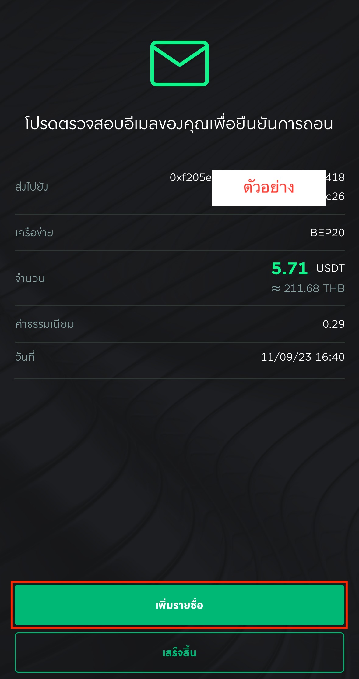 1. หลังจากดำเนินการถอนเสร็จสิ้นบนแอปพลิเคชัน กดที่ เพิ่มรายชื่อ