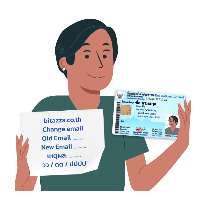 2) กระดาษที่เขียนข้อความ bitazza.co.th, Change Email, Old Email, New Email, วัน/เดือน/ปี ณ วันที่ท่านถ่ายภาพ และเหตุผลในการเปลี่ยนแปลงข้อมูล