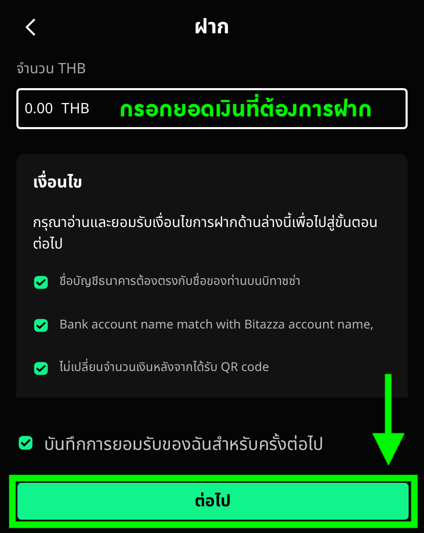 2.ใส่จำนวนเงินที่คุณต้องการฝาก จากนั้นติ๊กถูกในในช่องเงื่อนไขทั้งหมด และกดที่ ต่อไป
